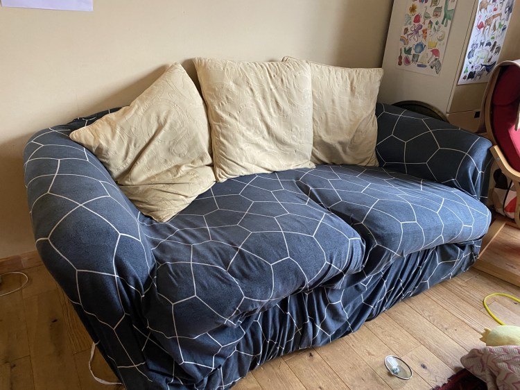 Both have dark blue sofa covers with a white geometric pattern.