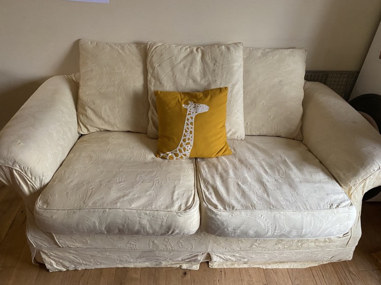 Pictured is the 3 seater sofa. Cream material (removable covers). Some marks (sharpie pen!). Giraffe cushion not included.